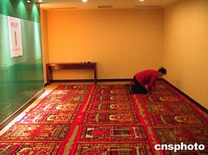 七月十五日,二零零四年中國(guó)亞洲杯足球賽重慶賽區(qū)舉行了指定下榻酒店揭牌儀式,為尊重不同國(guó)家的宗教和風(fēng)俗習(xí)慣,指定酒店還準(zhǔn)備了禱告房。圖為工作人員正在布置重慶賽區(qū)球隊(duì)下榻酒店內(nèi)的禱告房。二零零四年中國(guó)亞洲杯足球賽將于七月十七日正式開(kāi)幕。作者:郭晉嘉