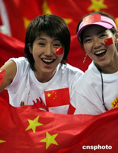 當?shù)貢r間8月17日,中國男籃在以雅典奧運會小組賽第二場比賽中以69比62艱難戰(zhàn)勝新西蘭隊,兩名來自北京的女球迷到場高喊:“我愛你,中國男籃!”。作者:任晨鳴