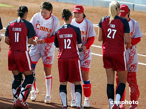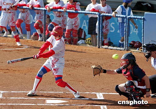 當(dāng)?shù)貢r(shí)間八月十七日,中國女子壘球隊(duì)(白)在雅典奧運(yùn)會出場迎戰(zhàn)實(shí)力強(qiáng)勁的美國隊(duì),一開場就有三名擊球手被封殺出局,最后以0:4失利。中新社記者:任晨鳴