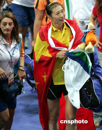 當?shù)貢r間八月十九日下午,中國羽毛球名將張寧以2:1力克荷蘭選手張海麗,獲得本屆奧運會女子單打冠軍,從而使中國金牌總數(shù)躍升至12枚。中新社記者:任晨鳴