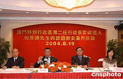 澳門特別行政區(qū)第二任行政長官候選人何厚鏵,十九日在濠景酒店與澳門旅游及飲食界代表舉行座談會,聽取業(yè)界人士在經營旅游及飲食業(yè)中存在的問題及意見。作者:梁永強