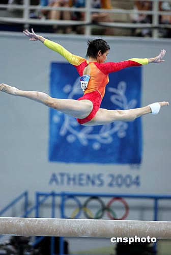 當(dāng)?shù)貢r(shí)間八月十九日晚,中國(guó)體操選手張楠獲得雅典奧運(yùn)女子體操全能銅牌。中新社記者:毛建軍