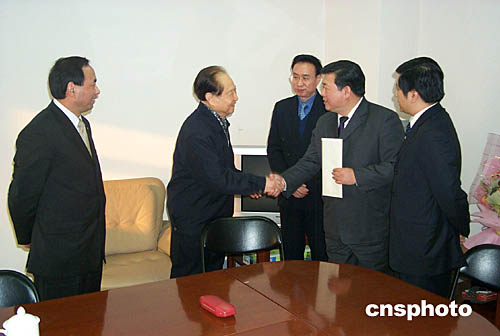 海協(xié)會(huì)長(zhǎng)汪道涵(左二)在上海委托其個(gè)人代表孫亞夫(右二)和李亞飛(中)赴臺(tái)悼念已故的;鶗(huì)會(huì)長(zhǎng)辜振甫。作者:葛鳳章