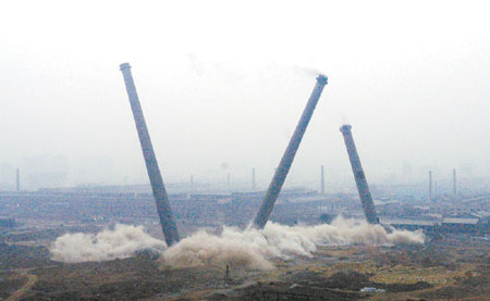 明天是2005年3月23日,原沈陽(yáng)冶煉廠的3根百米煙囪拆除一周年;將日歷回翻365頁(yè),2004年3月23日凌晨6點(diǎn),在許多老工人留戀的目光中,在全國(guó)各地的注目下,沈陽(yáng)老工業(yè)基地的標(biāo)志性建筑原沈陽(yáng)冶煉廠的3座百米煙囪轟然倒地。