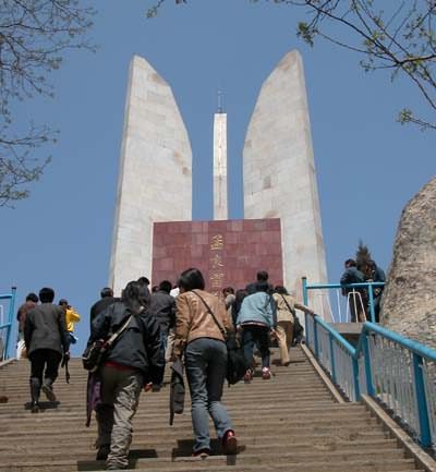 1984年為紀念孟良崮戰(zhàn)役在山上修建的紀念碑高30米,由三塊狀如刺刀的灰色花崗石筑成,象征著野戰(zhàn)軍、地方軍和民兵的武裝力量體制。底座為邊長20米、高1.6米的正三棱體,組成一個槍托,意喻槍桿子里面出政權。紀念碑的上下部構成一個有機的整體,象征著軍民團結(jié)必勝,人民戰(zhàn)爭必勝。