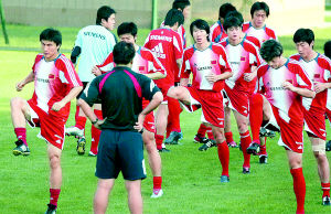 昨天傍晚5時(shí)30分開始的近兩個(gè)小時(shí)的訓(xùn)練中,朱廣滬拿出40分鐘的時(shí)間專門演練前場(chǎng)定位球。由于孫祥感冒沒(méi)有參加昨天的訓(xùn)練,罰角球的任務(wù)給了腳法秀麗的陳濤和鄭斌。