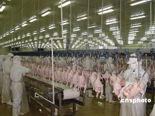 | 十一月十九日,閩北光澤縣圣農(nóng)集團有限公司的員工在屠宰車間消毒,防堵禽流感。圣農(nóng)集團有限公司是中國內(nèi)地現(xiàn)代化程度最高的集種雞飼養(yǎng)、苗雞孵化、肉雞飼養(yǎng)、屠宰加工、食品深加工為一體的聯(lián)合型白羽肉雞生產(chǎn)食品加工企業(yè),為保證雞肉食品的安全,該公司采取了一系列嚴格消毒措施。作者:陳國明