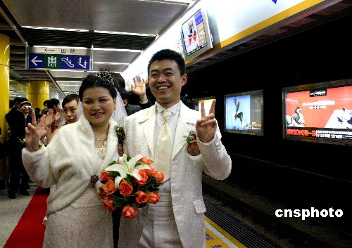 2006年元旦,一場(chǎng)浪漫的“幸福時(shí)光——全國(guó)首次地鐵集體婚禮”在南京舉行,六對(duì)新人乘上“開(kāi)往愛(ài)情的地鐵” ,參加永生難忘的集體婚禮。新人及親屬登上一節(jié)專(zhuān)門(mén)布置的喜慶地鐵婚車(chē),向同車(chē)乘客散發(fā)喜糖,接受祝福。作者:阿董