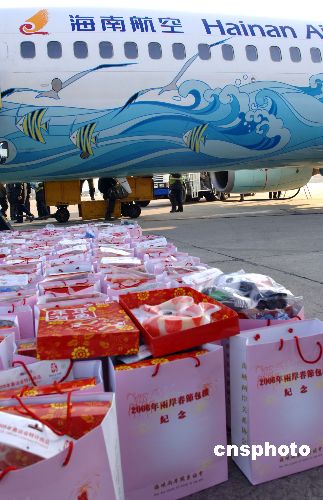 |   2006年1月25日上午,國(guó)航“奧運(yùn)號(hào)”CA197航班和海航“快樂(lè)海浪”HU7965航班先后由首都機(jī)場(chǎng)起飛,共運(yùn)載了230多位臺(tái)胞前往臺(tái)北。國(guó)務(wù)院臺(tái)辦副主任李炳才、民航總局副局長(zhǎng)楊國(guó)慶、北京市副市長(zhǎng)張茅、中航集團(tuán)總裁李家祥等分別向每一位乘客握手道別,并送上特別精美的"福娃"、“奧運(yùn)號(hào)”彩繪機(jī)模型和“年年有魚(yú)”年糕等禮品。作者:馬儒壯