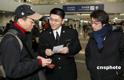| 圖:北京海關(guān)為首架兩岸直航班機(jī)乘客服務(wù)