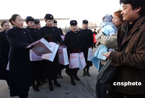 |   1月25日上午,國航“奧運號”CA197航班和海航“快樂海浪”HU7965航班先后由首都機場起飛,共運載了230多位臺胞前往臺北。國務(wù)院臺辦副主任李炳才、民航總局副局長楊國慶、北京市副市長張茅、中航集團總裁李家祥等分別向每一位乘客握手道別,并送上特別精美的"福娃"、“奧運號”彩繪機模型和“年年有魚”年糕等禮品。作者:馬儒壯