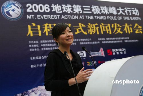 | 5月20日,2006地球第三極珠峰大行動啟程儀式新聞發(fā)布會在北京舉行,由社會環(huán)保志愿者、新聞媒體和企業(yè)代表組成的志愿者隊伍將于22日開赴西藏,展開為期16天的公益環(huán);顒;顒拥闹髦际恰皩崿F(xiàn)人類與自然的和諧統(tǒng)一”,將組建第一支“珠峰環(huán)保登山隊”,完成地球海拔最高村落的亮電工程,對地球海拔最高的一所小學(xué)進行教育捐助并建立地球海拔最高的教育工作站,定期進行珠峰地區(qū)的環(huán)境宣傳教育工作。圖為志愿者代表著名歌手葉蓓在新聞發(fā)布會上講話。中新社發(fā) 杜洋 攝