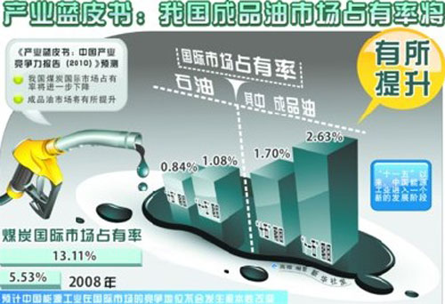中國社會科學(xué)院22日在北京發(fā)布的《產(chǎn)業(yè)藍(lán)皮書:中國產(chǎn)業(yè)競爭力報(bào)告(2010)》預(yù)測,我國煤炭國際市場占有率將進(jìn)一步下降,成品油市場將有所提升。