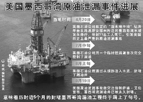 4月20日,由英國石油公司租賃的“深水地平線”鉆井平臺在美國墨西哥灣水域爆炸沉沒,造成了美國有史以來最嚴(yán)重的原油泄漏事故。此后,英國石油公司曾采取多種辦法封堵漏油,但效果一直不理想。