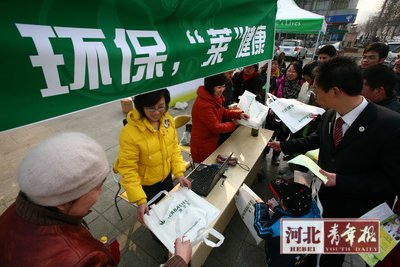 當(dāng)“低碳”口號越來越響,別以為低碳離我們有多遠(yuǎn)。細(xì)化到生活中,有時(shí)僅僅是少用一個(gè)塑料袋。昨日上午,省博物館廣場,康寶萊(中國)保健品有限公司河北分公司開展免費(fèi)發(fā)放環(huán)保袋活動(dòng)。9時(shí)30分開始,僅一小時(shí)的時(shí)間,近千只環(huán)保購物袋便發(fā)放一空。