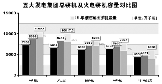 五家發(fā)電集團的工作報告顯示,清潔能源發(fā)電比重自“十一五”以來得到了大幅增長。其中,中電投的清潔能源發(fā)電裝機容量占總裝機容量比重高達30%,拔得頭籌。根據(jù)2008年國家電監(jiān)會發(fā)布的《2007年電力企業(yè)節(jié)能減排情況通報》(以下簡稱《2007年通報》),中電投2007年裝機容量4300萬千瓦,其中火電裝機3327萬千瓦,占77.37%。根據(jù)2009年國家電監(jiān)會發(fā)布的《2008年電力企業(yè)節(jié)能減排情況通報》(以下簡稱《2008年通報》),這一比例并沒有發(fā)生太大變化。但2009年以來,中電投的清潔能源發(fā)電比重增加到了30%。拉西瓦水電站實現(xiàn)一年四投使中電投的水電裝機容量居五大發(fā)電集團之首。預計隨著海陽核電、紅沿河核電和彭澤核電等項目的推進,這一比重還會大幅提升。