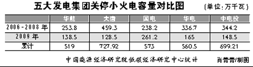 今年1月初,來自工業(yè)和信息化部的信息顯示,2009年全年關停小火電機組容量2617萬千瓦。去年電力行業(yè)的一件大事是“十一五”關停小火電的任務提前完成,小火電關停容量達到6006萬千瓦,30萬千瓦及以上火電機組占到了全部火電機組容量的64.46%。2007年,為實現(xiàn)“十一五”規(guī)劃綱要提出的單位國內生產總值能源消耗降低和主要污染物排放總量減少的目標,國家發(fā)改委頒布了《關于加快關停小火電機組的若干意見》的文件,對小火電關停做出了具體部署。本報對“十一五”以來華能、大唐、國電、華電和中電投等五大發(fā)電集團關停小火電的情況進行了統(tǒng)計,并對由此帶來的火電結構變化進行了調查,現(xiàn)將結果予以刊發(fā),以饗讀者。