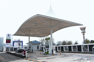 昨日中午,記者在武昌區(qū)秦園路水岸星城樓盤對面的一塊綠化帶看到,外形酷似兩把大傘的頂棚下,放置著兩臺加油機,共配有8把加油槍,提供93#和97#汽油,客戶可自助投幣或插卡為車加油,一天可滿足30噸加油量。該站僅占用一小塊綠化帶,罩棚材料為張拉膜,看上去就像馬路邊的一塊“綠島”。