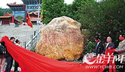 11月14日上午,廣州南沙天后文化學會第一屆理事會暨會員大會在南沙區(qū)召開。會后舉行了奇石安放儀式,一塊重達40多噸,專門從福建媽祖故里——莆田地區(qū)運來的奇石正式安放在天后宮廣場。據(jù)介紹,這塊黃臘石高3.5米,寬4.6米,厚2.2米,如此巨大的一塊天然黃臘石,極為罕見。