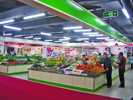 據介紹,升級改造的35處農貿市場增設休閑區(qū)域和休閑椅等人性化設施,配置LED顯示屏,有條件的市場實行“農加超”經營形式,使市場經營環(huán)境舒適明亮、一塵不染。為了讓市民消費更加放心,完成升級改造的農貿市場全部為經營生熟食品的業(yè)戶配置了冷藏保鮮設施,設立了無公害蔬菜檢驗檢測室,接通了豬肉零售追溯體系網絡,購置了溯源式電子秤,并實行品牌經營,引進品牌廠商,品牌產品進市場。