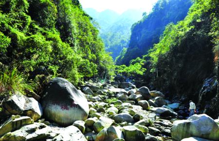 再走兩小時(shí),已是人跡罕至。遠(yuǎn)遠(yuǎn)望見一亂石懸崖,溪水纏繞,我們以為已到峽谷盡頭。飛踏巨石,沖到崖下,發(fā)現(xiàn)居然只是峽谷拐角———峰回路轉(zhuǎn),里面更長。