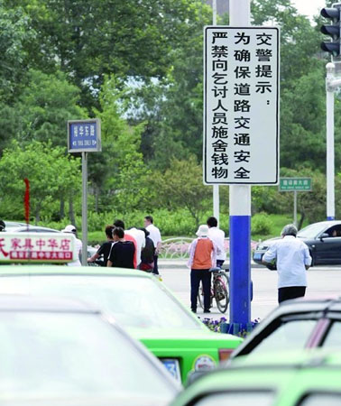 近來,在省城石家莊“迎賓大道”裕華路與建設(shè)大街交叉口,交管部門豎起的兩塊“新式”交通警示牌引發(fā)市民議論!盀榇_保道路交通安全,嚴(yán)禁向乞討人員施舍錢物”的警示語赫然入目,對此,記者在采訪中也聽到了社會各界的一些不同看法。