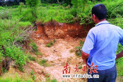 “又地陷了!”今年6月初,龍門縣龍?zhí)舵?zhèn)楊屋村村民再次發(fā)現(xiàn)村周邊的山地發(fā)生地陷時(shí),不安蔓延整個(gè)村莊。該村村民稱,從1992年開始,距離村莊約1.5公里外的鉛鋅礦開采后,農(nóng)田、果場(chǎng)等不斷出現(xiàn)地陷。