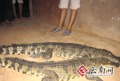 兩條分別重達(dá)60公斤左右的大鱷魚,趴在昆曼大通道勐臘段小磨公路的隧道里被發(fā)現(xiàn)后,兩村民竟然當(dāng)做“蛤蚧”撿回了家中。幸好,兩位村民迅速反應(yīng)過(guò)來(lái)。隨后,森林公安民警及時(shí)趕到,這個(gè)“玩笑”才沒(méi)有開(kāi)大。