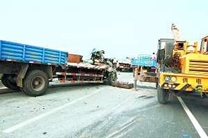今晨7時(shí)10分,目擊者趙先生正駕車經(jīng)南五環(huán)上班,正好目睹了這兩起事故。當(dāng)時(shí)他行駛到飲鹿池橋上,發(fā)現(xiàn)前方異常擁堵。車在原地停了大約10分鐘,幾乎一動不動。趙先生急著上班,下車向前想看看到底發(fā)生了什么事。他發(fā)現(xiàn)在他前方大約500米的地方,一輛大貨車側(cè)翻在最內(nèi)側(cè)車道。不知是因?yàn)樽矒暨^于嚴(yán)重,還是車太過破舊,這輛貨車四分五裂,不單駕駛室扭曲變形,幾乎完全從車身上脫離,前面兩個(gè)轱轆也飛了出去。