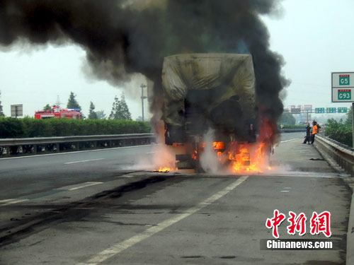 中新網(wǎng)德陽(yáng)8月9日電 (王超) 9日下午15時(shí)50分左右,一輛寧夏牌照的大貨車在行駛至四川成都—綿陽(yáng)高速德陽(yáng)黃許鎮(zhèn)路段時(shí),車身突然起火,導(dǎo)致車上裝載的20余噸硝硝酸銨(化肥)猛烈燃燒,濃煙彌漫,隨時(shí)都有爆炸危險(xiǎn),高速公路交通一度中斷。經(jīng)過(guò)德陽(yáng)消防官兵緊張?zhí)幹,終將險(xiǎn)情排除,此次受阻2個(gè)多小時(shí)的交通隨后慢慢恢復(fù)。