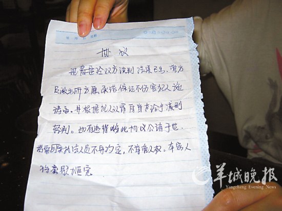 過了半個小時之后,施某提出要吃東西。“他已經(jīng)三天沒有吃東西,三天來他從沒下過樓,想起來我就心疼!庇谑鞘惣严聵琴I了兩個盒飯帶上去了!霸谶@段時間,我勸他:警察殺你很簡單,為什么不投案自首呢?如果自首他們會保證你的安全,如果你不放心,我們可以和他們簽一份協(xié)議!笔惣严蛴浾叱鍪井敃r協(xié)議的草稿,據(jù)施麗佳稱,協(xié)議的主要內(nèi)容為施某投案自首,警察保證他的安全,并根據(jù)自守的情節(jié)向法院求情。