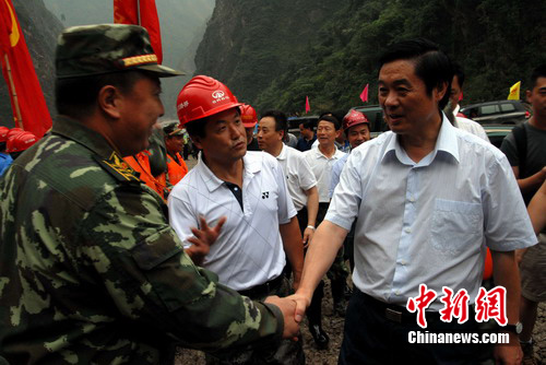 中新網(wǎng)綿竹8月17日電(王超)17日下午13時(shí)50分許,中共四川省委書記劉奇葆、副書記李崇禧,副省長鐘勉帶隊(duì)查看小崗劍道路搶通現(xiàn)場,親切慰問了在場搶險(xiǎn)的公安、消防、武警、省路橋公司等單位代表。