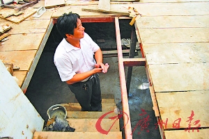 這個“地宮”位于南京市五塘廣場附近的白云新寓小區(qū)內(nèi),業(yè)主許先生,今年40多歲,安徽人。2009年,他在該小區(qū)買了一套面積為42平方米的房子,這套住宅南面與房屋相連有個院子,差不多有30平方米大。從圖片可以看到,院子被一層齊地的木板隔成地上和地下兩層,由樓梯相互連接。
