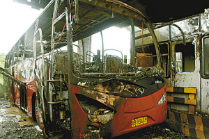 交警和消防人員接警后趕到現(xiàn)場,此前收費站工作人員已積極投入到滅火搶險中,乘客在司機(jī)的指引下均已從大巴砸碎的玻璃窗中順利逃出,在安全地方等待,無人員傷亡。在消防人員用高壓水龍頭噴射半小時后,大火才被撲滅了。