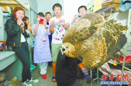 美術(shù)學院的女生小劉告訴記者,28日傍晚6時許,她第一個回到宿舍,剛進門陽臺外突然飛進來一只大鳥,沖著她的臉撲來,嚇得她抱頭尖叫,趕緊沖出了宿舍,“我仔細一看才發(fā)現(xiàn)是一只老鷹,我很害怕,就叫男生來幫忙了。”