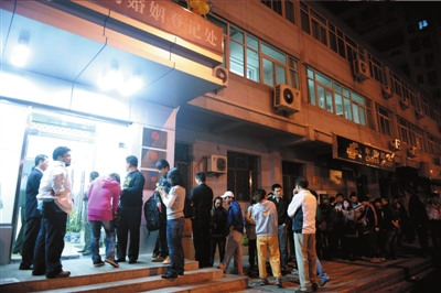 昨天凌晨5點多,海淀區(qū)婚登處門外已經(jīng)排起了近100米的長隊。排隊的人幾乎都是一對對,但排在第一位的卻只有一個人,是一名姓胡的中年男子。