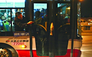 阿蘭(化名)是六里橋北里附近一名交通協(xié)管員,從2007年開始,她就在這里負責(zé)維持交通秩序。揮動小旗,右手推著乘客的背,配合著關(guān)門的節(jié)奏,順勢將乘客推上公交車。三年來,阿蘭每天早晨都要不停地重復(fù)這套動作,尤其是對擠300路、323路和661路車的乘客。