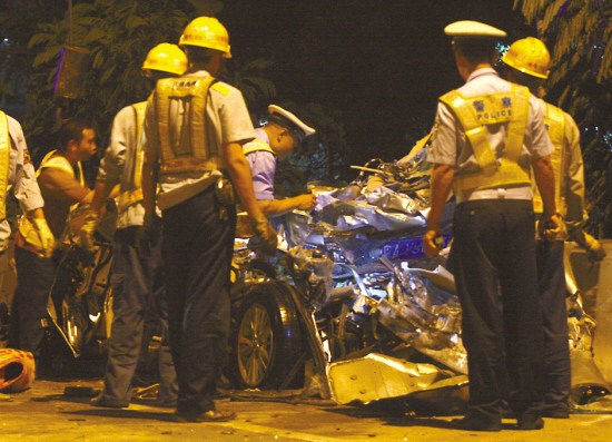 羊城晚報(bào)記者昨晚9時(shí)許來到北二環(huán)高速米龍大橋路段,只見東往西方向車道上,停滿了救援車輛,大批交警、消防員和救援人員在緊張工作中。記者看到,在出事的米龍大橋路肩上,停著兩輛大貨車、一輛黑色小轎車和一輛綠色面包車。大約在9時(shí)30分,救援人員從已被撞成廢鐵的黑色小轎車中救出一名男子和一名女子,兩人看上去均年約20多歲?上,經(jīng)現(xiàn)場救護(hù)人員診斷,兩人已當(dāng)場死亡。