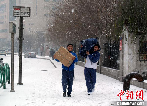 記者在烏魯木齊街頭看到,道路上的行走較往日減少,因為天冷路滑,市民大多都擠上了公交車,還有人焦急地等待出租車。到中午11點(diǎn)時,雪花開始變大,記者到外面拍照采訪,來回不到二十分鐘的時間里,記者身上落滿了一層雪花。