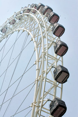 記者在施工現(xiàn)場看到,永樂橋摩天輪的外圈掛滿了黑色廂體,整整48個,施工人員只用了兩天的時間就將它們?nèi)堪惭b到位。據(jù)介紹,在安裝座艙之前,摩天輪就已經(jīng)通過了抗壓、抗?jié)B、抗折、抗凍等強度試驗,并完成了電力驅(qū)動裝置的安裝,前期準備工作一切就緒,座艙運到后立即安裝,所以才如此神速。施工人員告訴記者,座艙是完全透明的,非常漂亮,但為了避免它們在施工過程中受到污染及損壞,才給它們都套上了一個黑色的罩子,以起到保護的作用。