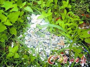 昨日,記者來到東城區(qū)溫塘村文塔路,在墓地走了一圈,發(fā)現(xiàn)這個地方大約有300多平方米,后面是一片竹林,小山頭上雜草眾生,周圍有幾棟爛尾樓,不遠處有幾間小廠。即使是中午時分,也很少有人經(jīng)過,因7日晚上突然下起大雨,一些未收拾干凈的骨灰聚集在一起,隨著雨水貼在草地上,與重陽節(jié)當?shù)卮迕窦雷鏁r留下的鞭炮碎紙片交融在一起。