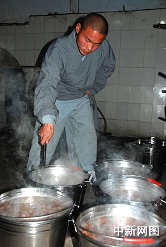中新網鄭州12月31日電(記者 朱曉娟)為確保臘八節(jié)施粥順利進行,12月30日中午少林藥局的師父們便在少林伙房試煮五行八寶粥。