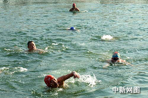 中新網濟南1月1日電(記者 張榮容 見習記者 趙金鵬)2009年的第一天,全國第二屆冬泳大賽在山東省城濟南大明湖景區(qū)內舉行。來自北京、天津、山東濟南、東營、濱州等省市的17支代表隊116名冬泳愛好者相聚濟南大明湖畔,不畏零下8攝氏度的嚴寒,以冬泳的方式迎接新一年的開始。