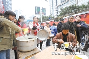 張世文說,他們一共準(zhǔn)備了50公斤大米、15公斤蘿卜、10公斤豬肉和部分白菜,但沒有想到直到昨日中午12時左右,來喝粥的也不過10多人,整整一大鍋的稀粥還剩下一大半。擔(dān)心部分流浪者抹不下面子,志愿者們決定主動上門送粥。在臨江門地下通道重百超市臨江門店旁的出口梯坎上,長期住有10多個流浪者。但面對志愿者們送上門來的一大鍋稀飯,流浪者們居然一哄而散,很快跑得無影無蹤,留下一地雜亂的棉絮衣服。