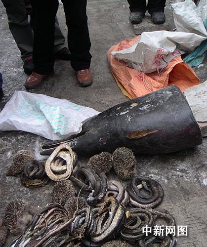 中新網(wǎng)吉林1月3日電(蒼雁)近千條野生錦蛇,一只海豚頭和刺猬在吉林市場(chǎng)被叫賣(mài),1月3日,吉林市林業(yè)局稽查支隊(duì)查獲了這些在冬天里被捕殺的珍貴野生動(dòng)物。