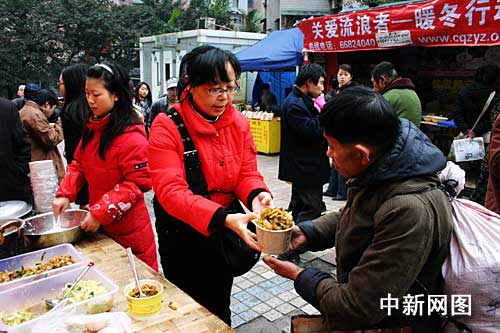 元旦期間,從四川南充到重慶打工的農(nóng)民工張世文和他的妻子楊伊婧,在重慶市臨江門一公交車站旁組織設立了一個求助點向流浪漢免費施粥。而此前,為把施粥的消息公布出去,張世文請其朋友到網(wǎng)絡上四處發(fā)帖,希望媒體采訪報道,引起社會關注。據(jù)了解,張世文是重慶市社區(qū)志愿者總隊負責人,楊伊婧也是其中一員。