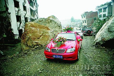 眼見一對(duì)貼著大紅喜字的結(jié)婚車隊(duì)擦肩而過,敏銳的遲阿娟跳下車拿著鏡頭緊追,“我以最快速度緊追行駛的迎親車隊(duì),差點(diǎn)跑斷腸子……”未能打聽到進(jìn)一步信息,遲阿娟很遺憾:“他們說新人不能下轎,車子不能停留,新人不愿說出名字,更不愿留下電話,只是說:我們是北川人,地震雖然奪走了親人、財(cái)產(chǎn),但是,生活還是要繼續(xù)!”