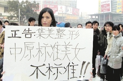 “人為地給美女定下標(biāo)準(zhǔn),是對中原女性的不尊重。”昨日下午,二七塔下,一名身材高挑、披肩長發(fā)、顴骨高凸、細(xì)看還有喉結(jié)貌似女人的男子舉著一塊牌子,牌子上寫著:正告集美整形,中原標(biāo)準(zhǔn)美女不標(biāo)準(zhǔn)!這名男子不時用雙手將牌子舉過頭頂,引得周圍的人們指指點(diǎn)點(diǎn)。