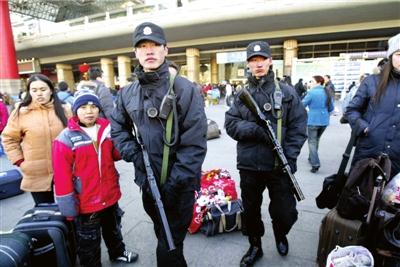 昨天,持槍特警在北京西站巡邏。當(dāng)天,記者從北京鐵路警方獲悉,為確保春運(yùn)期間旅客的安全,目前,鐵路警方已安排30名特警進(jìn)駐北京站和西站,負(fù)責(zé)在站前廣場(chǎng)24小時(shí)持槍巡邏。(本報(bào)記者 王儉 王鵬昊 攝影報(bào)道)
