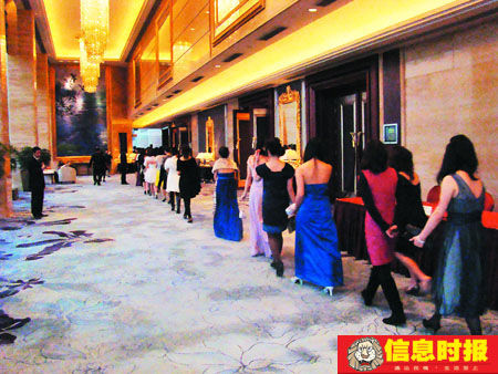 1月10日晚,備受關注的廣州史上最昂貴的“世紀佳緣.名仕之約”相親會,終于揭開了神秘的面紗,在廣州一家五星大酒店里,從6000多名報名者中脫穎而出的40名美女,嚴冬之下穿著單薄、靚麗的晚禮服,邁著貓步,擺出媚態(tài),供30名鉆石王老五們鑒賞。[1月11日[[信息時報]]]